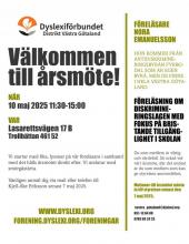 Måndag den 10 mars 2025 mellan 18-20 på Kruthusgatan 17 i Göteborg. Anmälan sker till Kjell-Åke Eriksson senast den 6 mars på telefon 0703 60 24 25 eller via mejl goteborg@dysleixi.org Varmt välkommen önskar Styrelsen!