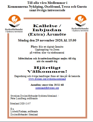 Välkommen på (Extra) Årsmöte med Dyslexiförbundet i Sydöstra Sörmland, Söndag den 29 november-2020, kl. 15.00
