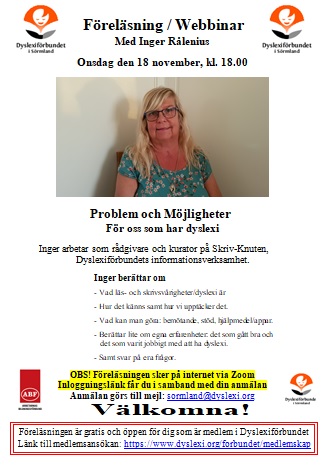 Webbinar - Föreläsning med Inger Rålenius "Problem och Möjligheter För oss som har dyslexi"